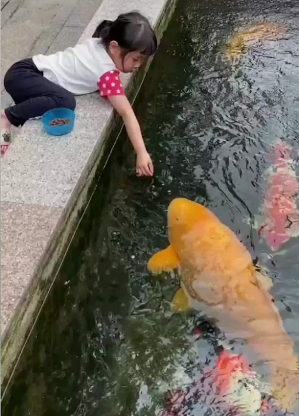 Девочка покормила огромного 25-килограммового домашнего кои в пруду частного дома, на юге Китая. Видео было снято в городе Чжуншань провинции Гуандун. http://www.youtube.com/watch?v=Ct4X3oA25fIПо словам заводчика г-на Юаня, маленькая девочка является другом семьи, и ей 5 лет. Для сравнения, кои,... Далее